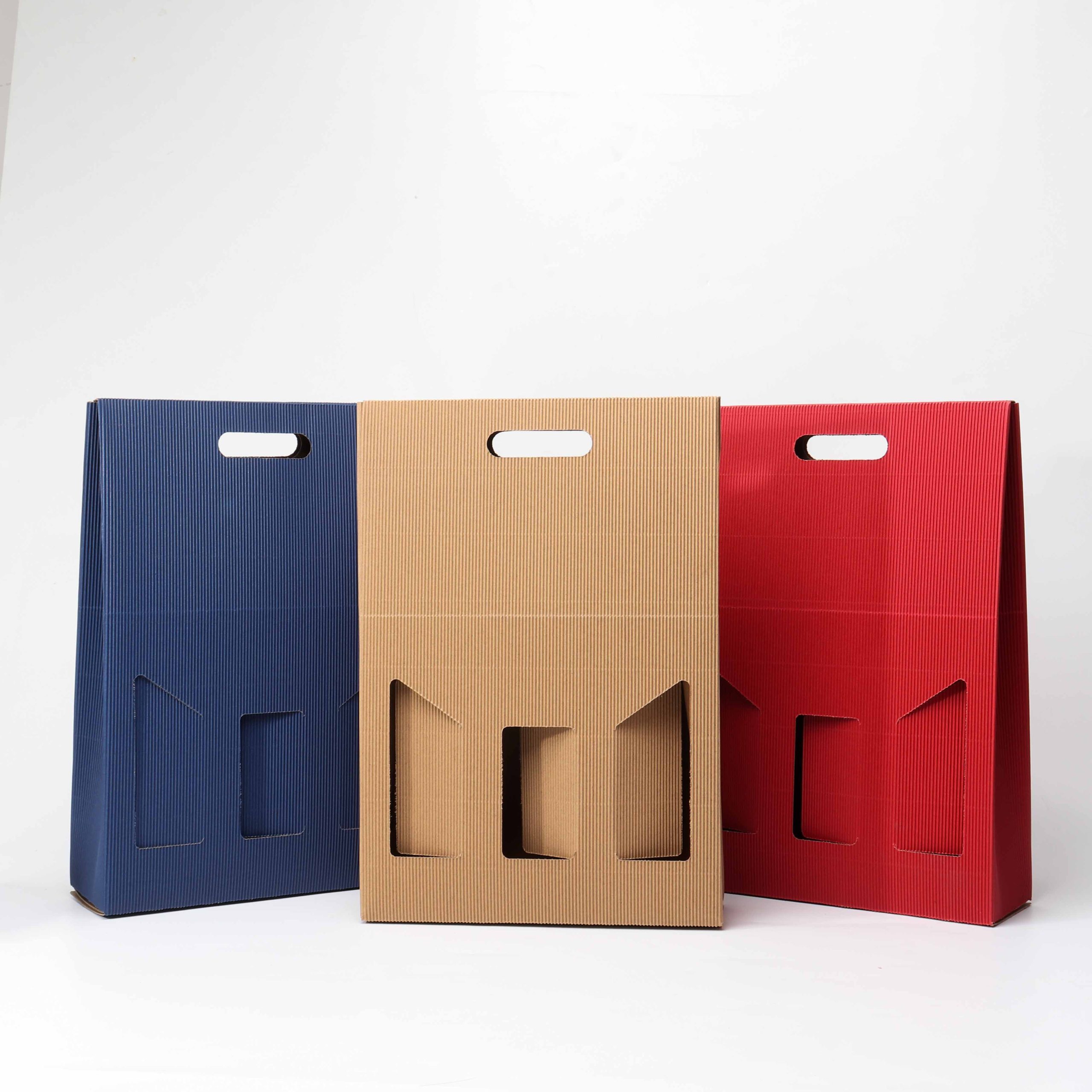 Available in multiple colors, such as classic kraft paper, sophisticated dark blue, and festive red, to match different brands and occasions. With its simple structure yet practical functionality, it is a wine packaging solution that combines environmental friendliness with market appeal.