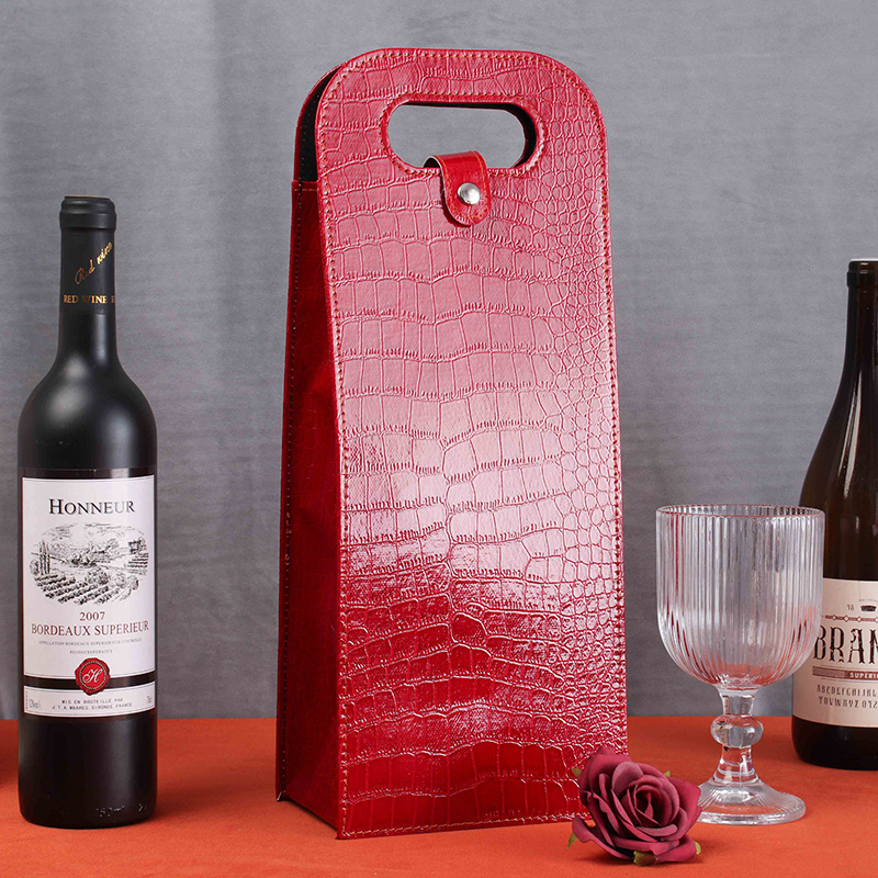 Present your wine in style with our premium leather wine gift bag. Made from high-quality faux leather with a crocodile-texture finish, this wine bottle tote offers both elegance and durability. The structured design ensures your bottles remain safe and upright, while the snap-button closure adds both security and a refined touch.