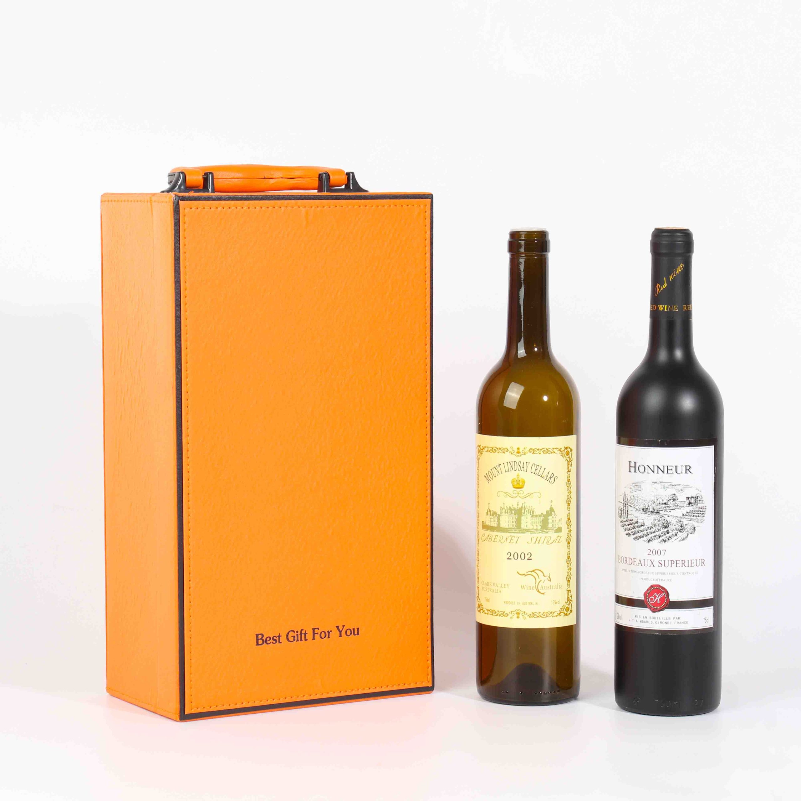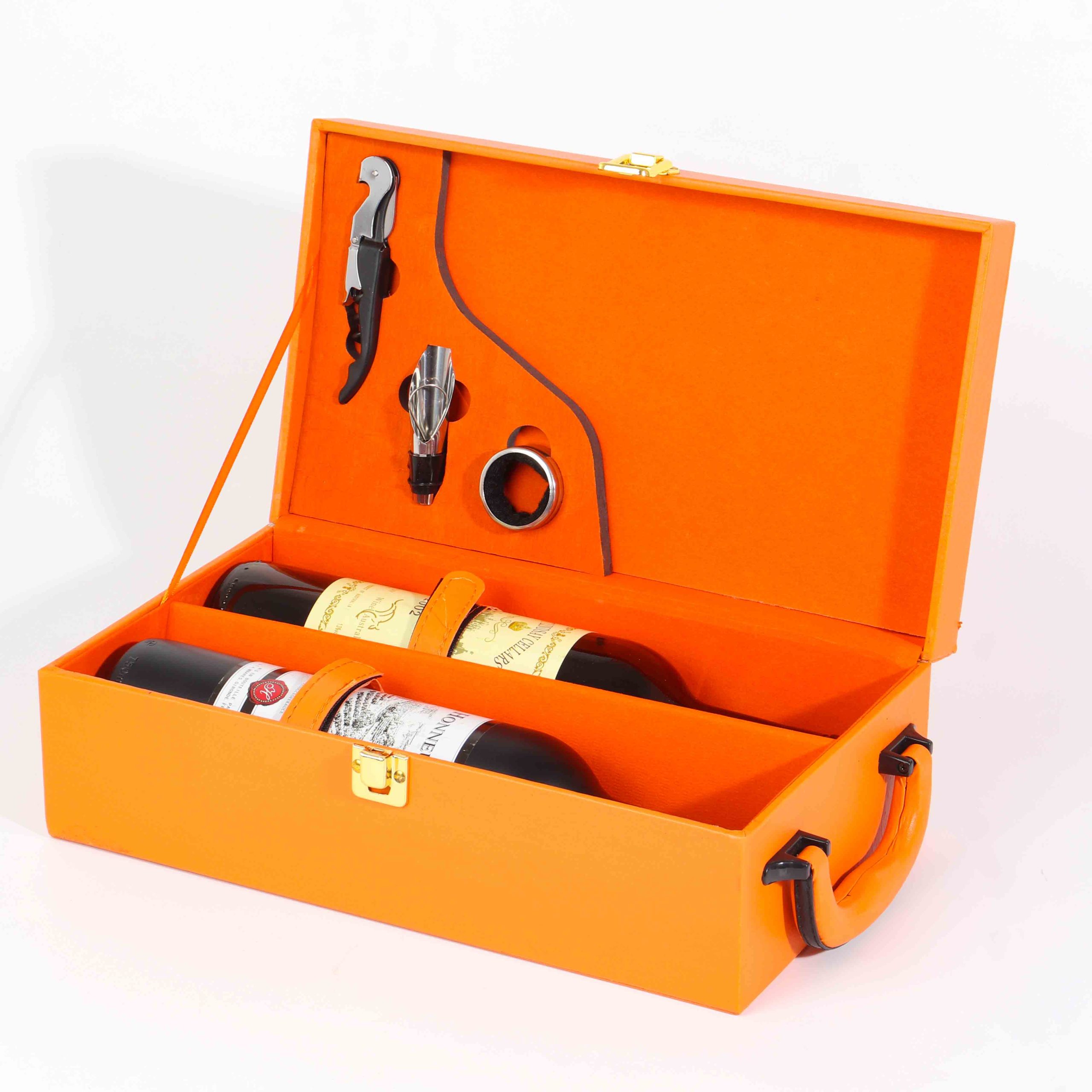 This premium double wine gift box, designed for holiday gift giving, features a luxurious Hermès orange exterior and premium leather for a tactile, luxurious look, adding a touch of sophistication to your wine display. This wine box seamlessly blends vibrant color with practical design. The bright orange finish with black trim creates a striking visual effect, while the ergonomic leather handle ensures easy carrying.